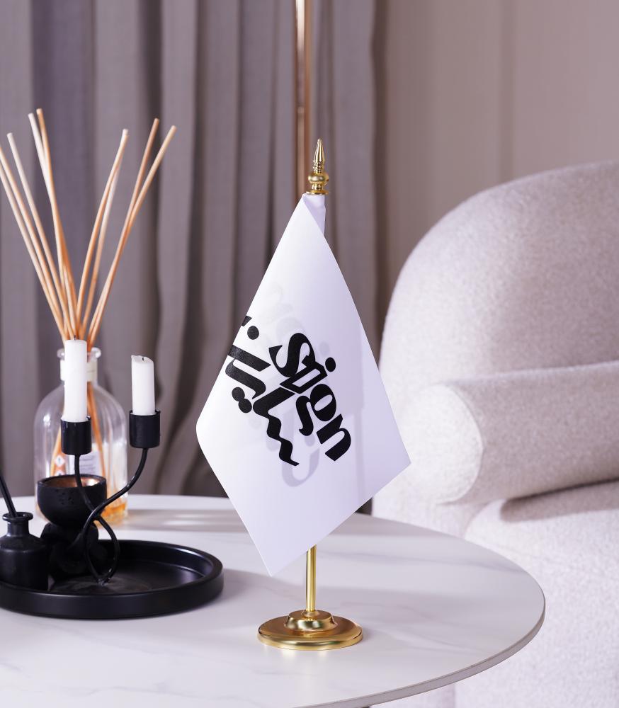 علم مكتبي يتصميمك الخاص, وسارية متوفرة باللوننين الذهبي والفضي بتصميم عصري راقٍ تضفي لمسة من الأناقة والبساطة على مكتبك أو قاعة الاجتماعات. تتميز بجودة عالية ومتانة تجعلها خيارا مثاليا للمناسبات الرسمية أو الاستخدام اليومي.