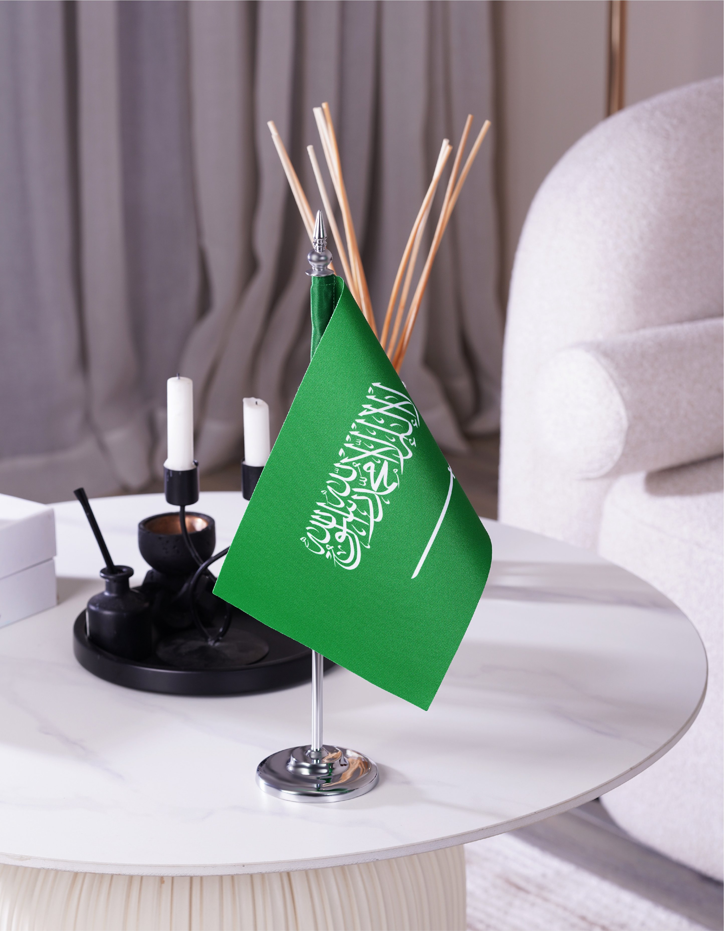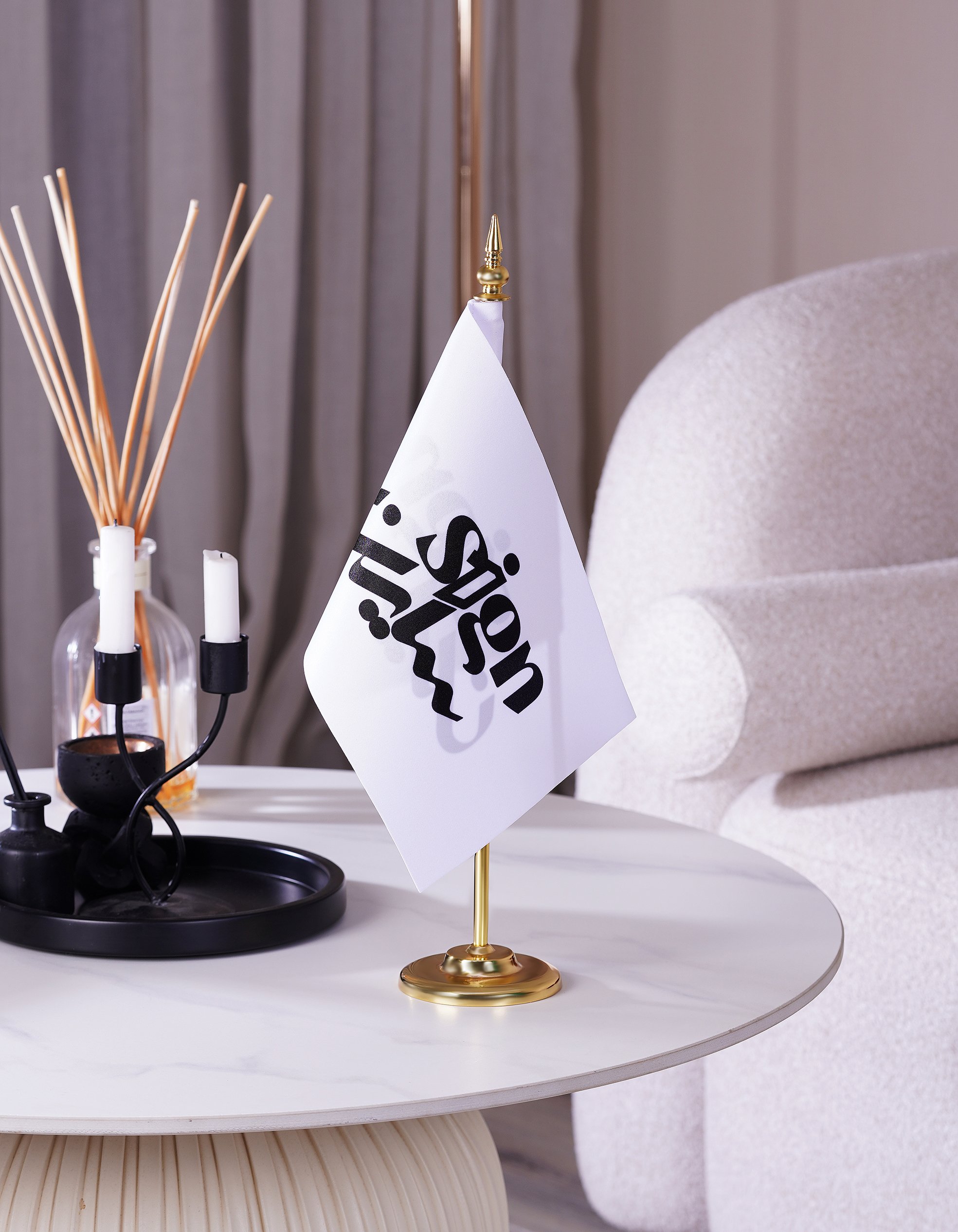 - 2 علم كبير فاخر مع السارية من اختيارك + 2 علم مكتبي أنيق مجاناً يحمل شعارك أو تصميمك الخاص.